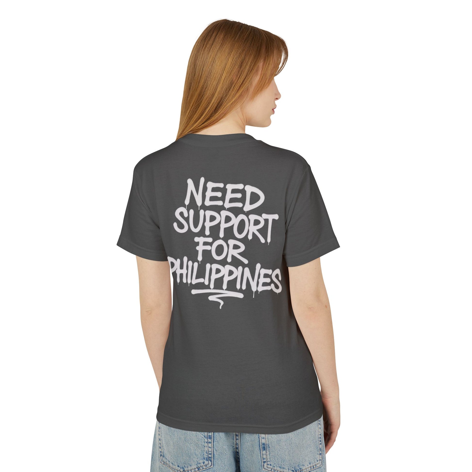 This heavyweight cotton tee carries a quiet, determined voice. A small chest print reads “FRIENDS HELPING FRIENDS,” while the back makes the message bold and urgent with a hand-painted style: “NEED SUPPORT FOR PHILIPPINES.” The garment-dyed finish gives the charcoal tone a lived-in look that feels familiar from the first wear. The relaxed cut drapes comfortably — an easy layer for relief volunteers, community organizers, or anyone standing with affected families. It’s the kind of shirt you reach for when you want to show solidarity without shouting, when you need your message to read as sincere and steady rather than flashy. Wear it to fundraisers, community meetings, or while packing relief boxes — it moves with you and keeps the focus where it belongs: people and support.